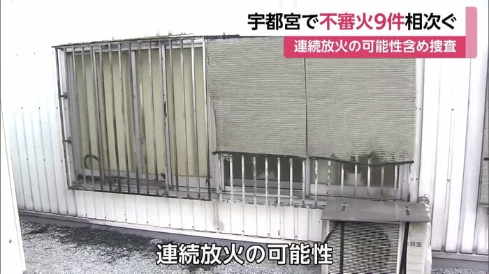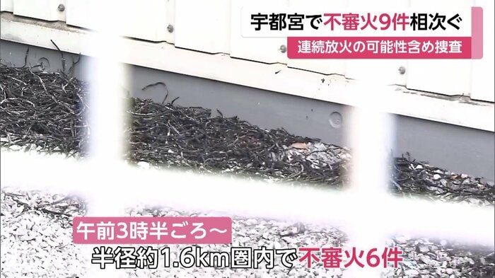 これに先立ち、宇都宮市内ではきのう午前2時半ごろに雑木林が焼ける火事や、午前3時半ごろから1時間の間に、半径約1.6キロの範囲で室外機などが焼ける不審火が6件相次いだほか、午後8時半ごろに河川敷で下草が焼ける火事があった。