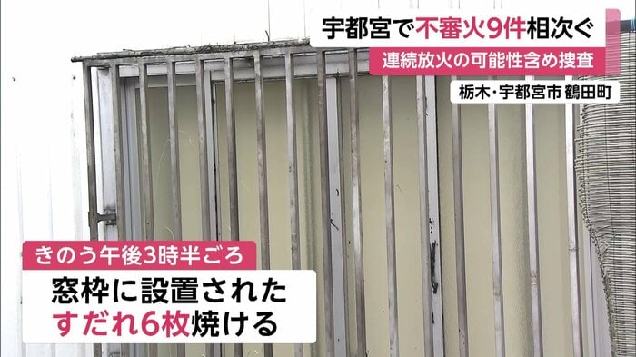 きのう午後3時半ごろ、宇都宮市鶴田町のリサイクルショップの従業員が窓枠に設置されたすだれ6枚が焼けた跡を発見した。
