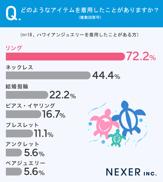リングやネックレスといった定番のジュエリーが上位を占める一方で、結婚指輪として選んでいる人も2割以上おり、ハワイアンジュエリーが日常使いだけでなく、特別な記念のアイテムとしても選ばれていることがうかがえます。