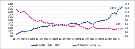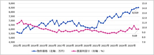 一方、平均利回りは物件価格が上昇したにもかかわらず、全種別で前四半期から上昇しました。特に都心部など賃貸需要の強いエリアを中心に賃料水準の上昇が進み、平均利回りを押し上げている可能性が考えられます。