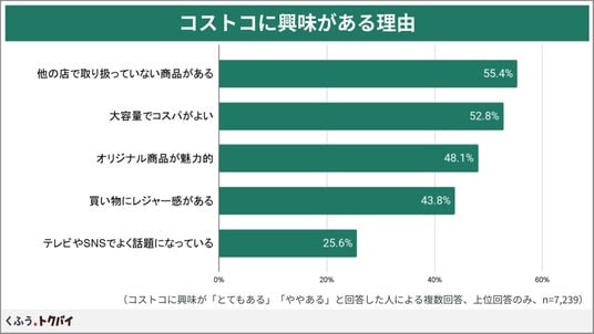 「コストコに興味がある」と回答した人は70.7%(「とても興味ある」34.3%、「やや興味ある」36.4%の合計)。興味がある理由として、「他の店で取り扱っていない商品がある」(55.4%)、「大容量でコスパがよい」(52.8%)、「オリジナル商品が魅力的」(48.1%)が上位に挙がりました。コストパフォーマンスや独自性など、販売商品に魅力を感じている人が多いことがわかります。
