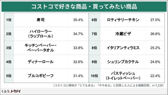 好きな商品、買ってみたい商品をたずねたところ、"コストコといえば"の看板商品が並ぶ中、僅差で「寿司」(35.4%)が1位となりました。デリカ、ベーカリー、簡便調理品、日用品とさまざまなジャンルの人気商品が支持を集めています。