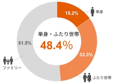 ■家族構成・年齢:約半数が単身・ふたり世帯。平均年齢は38.9歳。