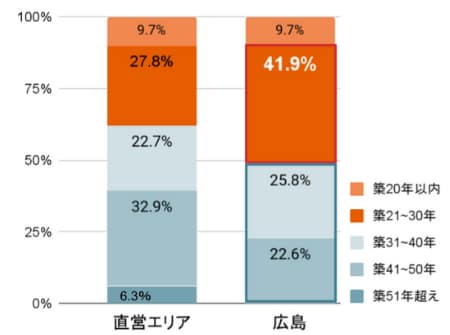 ■購入物件築年数:「築21年~30年」の割合が最も多い。約半数が築31年以上。成約物件の築年数において、最も多かったのは築21年~30年の物件でした。これはリノベるの直営エリア(⾸都圏・関西・東海の主要エリア)と比較しても非常に多い割合です。また、約半数は築31年以上を選択していました。築21年~30年の物件が多く選ばれているのには、広島のマンションストック事情が関係しています。築年数別のストック戸数について、東京・全国平均と比較すると、広島県は築40年超えのマンションストックが少なく、築11年~40年のストックが多いことが分かります(※2)。この世代の物件は、経年によって下落する不動産価格が安定し、かつ耐震基準も満たしているため、まさにリノベーション適齢期の物件です。リノベーション適齢期の物件が豊富にある広島では、今後ストックを活かした中古住宅流通がますます加速すると考えられます。