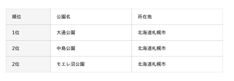 北海道地方では、札幌市内の大規模公園を中心に票が集まりました。以下は、調査回答で挙げられた公園名を票数順にまとめたランキングです。