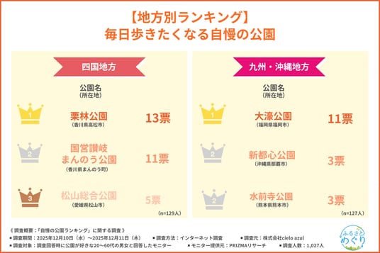 本調査は、同社が運営する暮らし密着メディア「ふるさとめぐり」の企画として実施したものです。あわせて、回答結果からは、人々が「毎日歩きたくなる」と感じる公園の条件や、地方別に支持される公園の傾向も見えてきました。