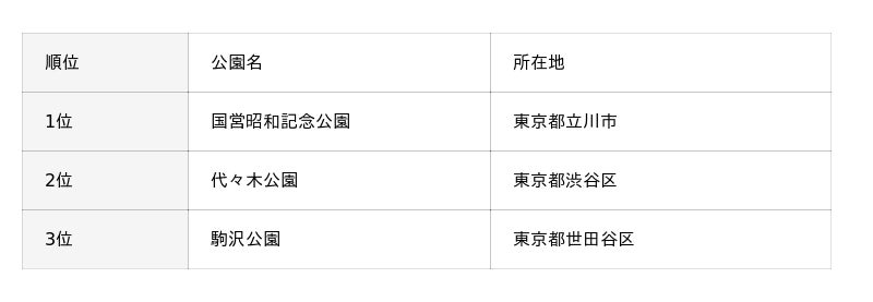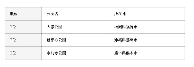 本調査では、各地域ごとに回答数や挙げられた公園数にばらつきがあるため、本記事では各地域の上位公園(同率含む)を中心に掲載しています。