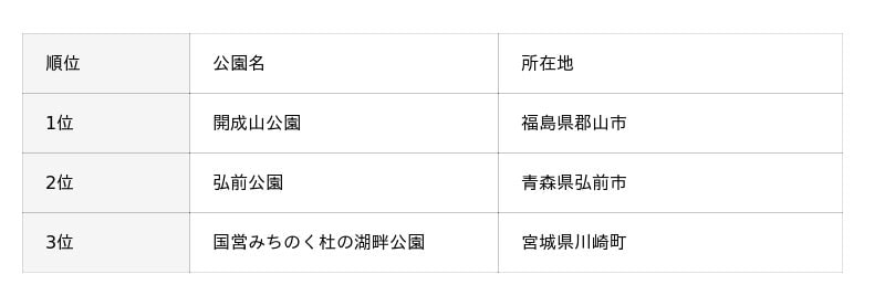 東北地方では、歴史的な公園や広域型公園を中心に票が集まりました。以下は、調査回答で挙げられた公園名を票数順にまとめたランキングです。