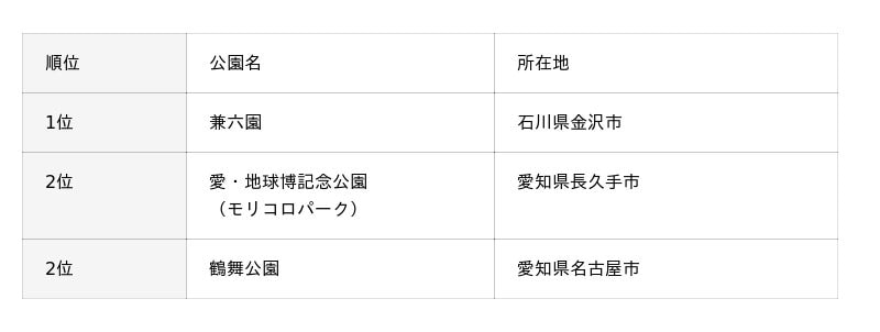 中部・北陸地方では、歴史的価値のある庭園や、広域型の大規模公園が上位に挙がりました。