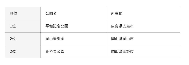中国地方では、地域を代表する象徴的な公園が上位を占めました。