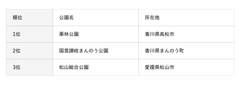 四国地方では、全国的にも知名度の高い庭園や国営公園が多く挙げられました。
