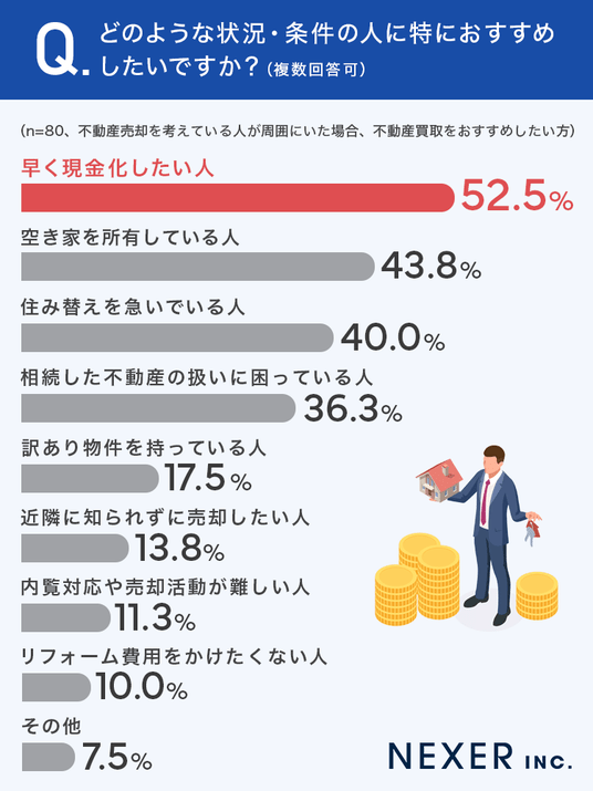 最も多かったのは「早く現金化したい人」で52.5%、次いで「空き家を所有している人」が43.8%、「住み替えを急いでいる人」が40.0%と続きました。また「相続した不動産の扱いに困っている人」も36.3%と高い割合を示しています。