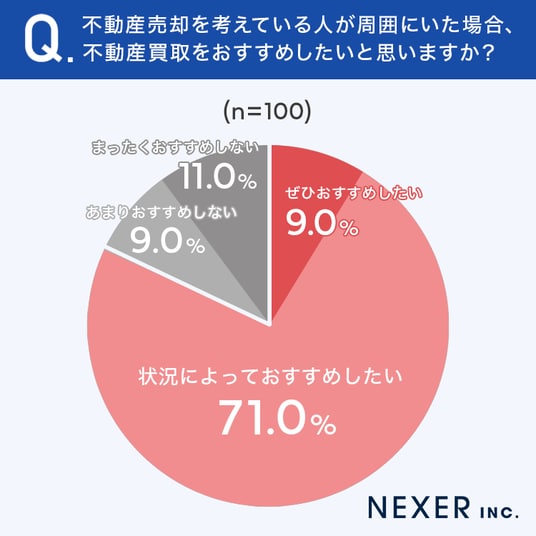 「ぜひおすすめしたい」と回答した人は9%、「状況によっておすすめしたい」と回答した人は71%でした。これらの回答を合わせると、80%もの人が不動産買取を周囲におすすめしたいと考えていることがわかります。