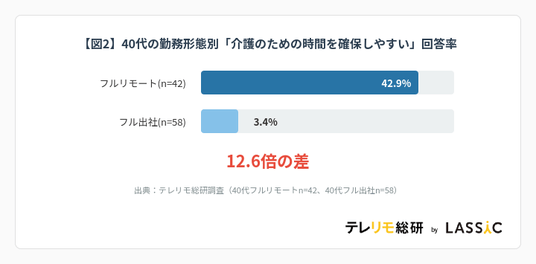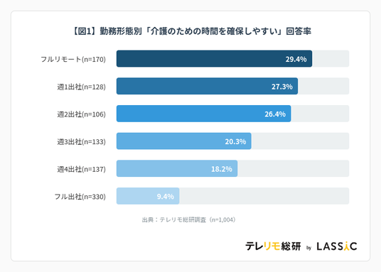 フルリモート勤務者の29.4%が「介護のための時間を確保しやすい」と回答し、フル出社者(9.4%)の3.1倍に達することが、テレリモ総研の調査で明らかになった。