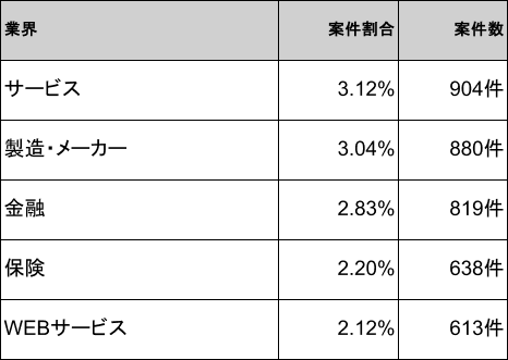 2026年1月時点のPMO向けフリーランス案件・求人は、サービスが3.12%(904件)で1位、製造・メーカーが3.04%(880件)で2位、金融が2.83%(819件)で3位となっています。以下、保険が2.20%(638件)で4位、WEBサービスが2.12%(613件)で5位と続き、上位5業界で全体の約13.3%を占める結果となりました。
