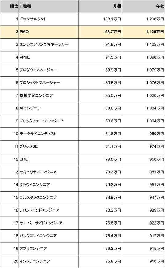 PMO案件の平均月額単価は93.7万円、平均年収は1,125万円で、職種別平均年収ランキングでは2位に位置しています。
