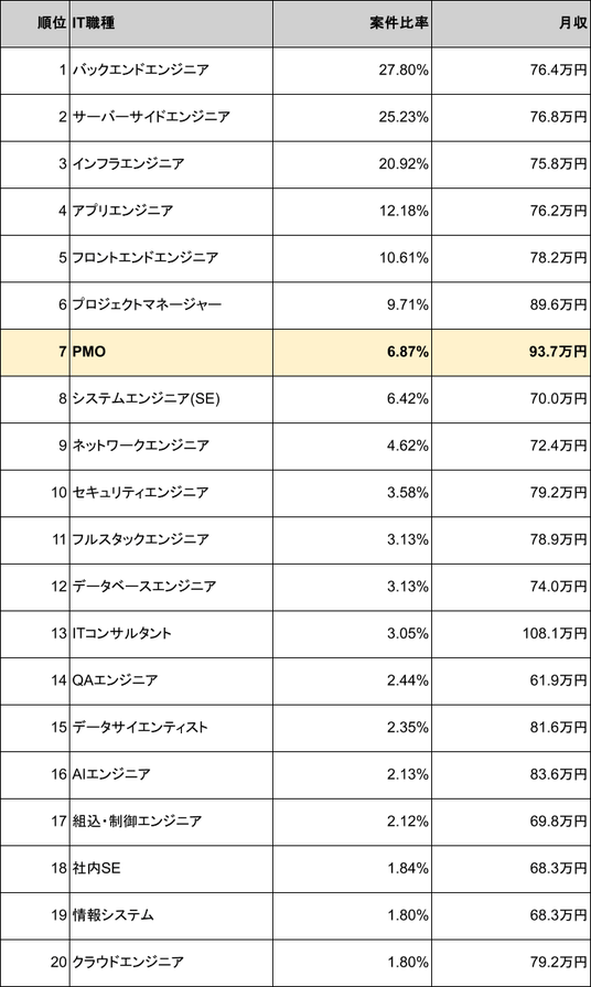 PMOの案件は市場全体の6.87%を占め、IT職種別の案件数ランキングでは7位に位置しています。平均月額単価は93.7万円と高水準で、専門性が評価されている職種といえます。