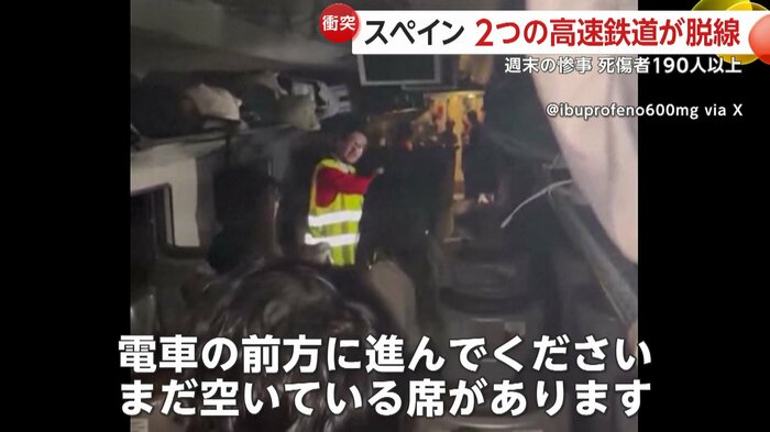 事故後の車内をとらえた映像では、乗務員らしき人物が「電車の前方に進んでください。まだ空いている席があります」と、乗客を落ち着かせようと呼びかけていた。
