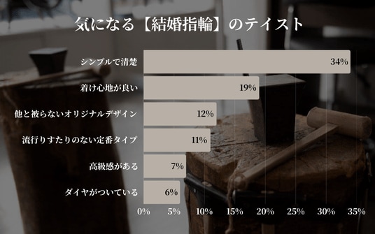 毎日身に着けるものとして、飽きのこないデザインとストレスのない装着感が最優先される傾向にあります。一方で「オリジナルデザイン(12%)」への関心も一定数あり、「シンプルながらも自分たちらしさを添えたい」という手づくりならではのニーズが読み取れます。