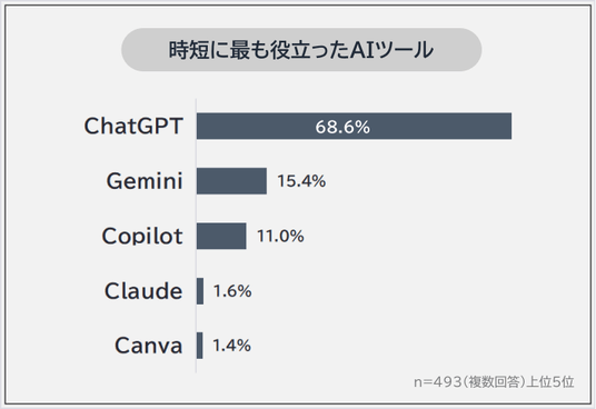 時短に最も役立ったAIツールの圧倒的1位は「ChatGPT(68.6%)」でした。2位「Gemini(15.4%)」、3位「Copilot(11.0%)」が続きます。