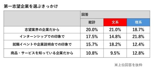 文理別では、理系は「インターンシップでの印象で」(21.8%)が最多、文系は「志望業界の企業だから」(21.0%)が最多となりました。