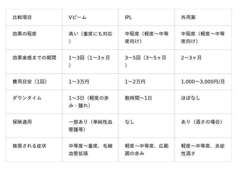 赤ら顔・酒さ治療法の比較(Vビーム・IPL・外用薬)