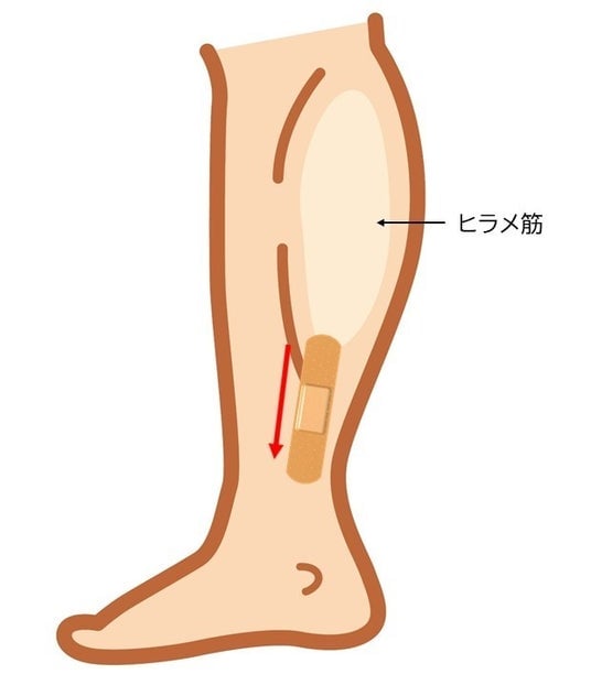 ふくらはぎの奥にある「ヒラメ筋」に絆創膏を貼ることで、筋肉の働きをサポートします。すねの内側に手を当て、かかとを上下に動かしたときにポコッと盛り上がる部分がヒラメ筋の起点です。そこを支点に、下方向へ軽く引っ張るように絆創膏を貼ります。反対側も同様に行います。
