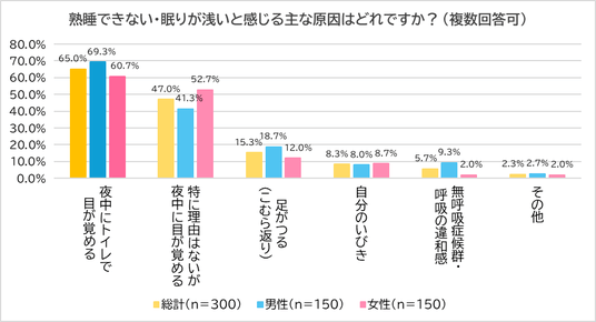 ・熟睡できない・眠りが浅いと感じる原因の最多は「夜中にトイレで目が覚める」・夜中のトイレは「1回」が多数派