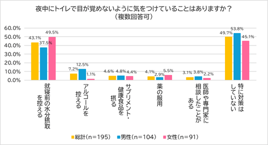「夜中にトイレで目が覚めないように気をつけていること」を聞いたところ、最も多かったのは「就寝前の水分摂取を控える」(総計:43.1%、男性:37.5%、女性:49.5%)でした。しかし、その割合は4割程度にとどまり、約半数は「特に対策はしていない」(総計:49.7%、男性:53.8%、女性:45.1%)と回答しました。