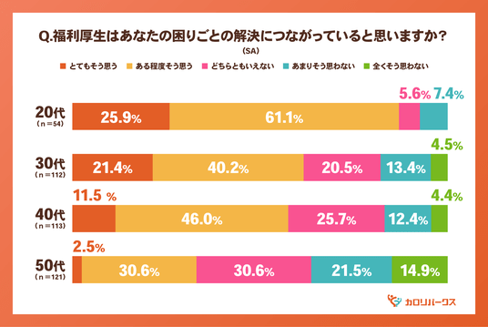 2. 福利厚生は困りごとの解決策として20代は高評価、50代は「実感しにくい」現実