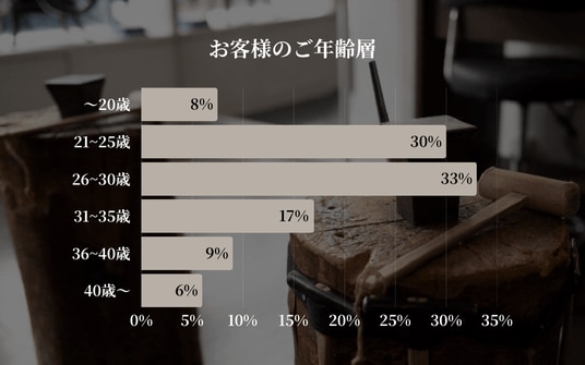 「20代後半(26~30歳)」が約33%ともっとも多く、次いで「20代前半(21~25歳)」が約30%と、全体の6割以上を20代が占めています。一方で、11月・12月の年末にかけては30代・40代の割合も上昇する傾向が見られました。これは、クリスマスや記念日といった特別な節目を前に、落ち着いた空間での『モノづくり体験』を求める大人のカップルが増えたためと考えられます。