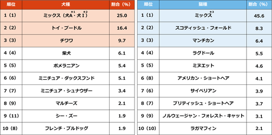 ◆(犬)(猫)「ミックス」が昨年同様1位、(犬)「シー・ズー」が2年ぶりにトップ10入り