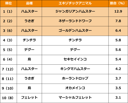 ◆(小動物)ハムスター、うさぎ、チンチラやデグー、インコ、フェレットなど多様な品種がトップ10入り