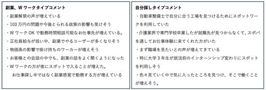 ・キャリア形成:新しい分野に挑戦したい、自分に向いている仕事や職場の雰囲気をお試しで見極める。スポットワークから正社員になった事例も。