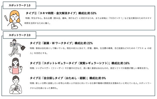 当社は、これまでの「空いた時間にバイト、急な金欠、だけではない」新たなワーカーの活用事例が増えている潮流を「スポットワーク2.0」と定義しました。