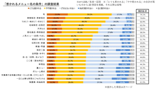 「外食で惹かれるメニュー名の条件」についての調査では、「とても惹かれる」「やや惹かれる」の合計が高かったものに、「旬」「期間限定」「できたて」など、“今しか食べられない”感を演出するものが並びました。これらは「早く行かないとなくなってしまうかも」「今だけの体験ができる」という心理を刺激しやすく、注文にもつながりやすいのではないでしょうか。また「地域限定・店限定」や「天然もの」「朝採れ」といった“こだわり”系も支持を集め、情報に触れた瞬間に“食べる価値”がわかるかどうかも鍵になっていると考えられます。これらの傾向から、惹かれるメニュー名の条件には共通して「食べる理由がすぐ伝わる」特徴があるといえそうです。具体的に消費者が“納得して選べる情報”が瞬時にわかる表現が、重要視されていると思われます。