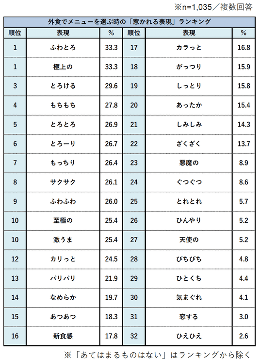 外食でメニューを選ぶ時の「惹かれる表現」では、5位までにランクインした「ふわとろ」「とろける」「もちもち」「とろとろ」など、口の中での感覚を連想させ、食欲に訴える力が非常に強いものが多く並びました。また8位~22位までにランクインした「サクサク」「カリっと」「パリパリ」「ざくざく」などの擬音語系は特徴が明確で、揚げ物やスナック系メニューと親和性が高いものの、メニュージャンルや提供シーンが限定されるため“万人受け”しづらかったかもしれません。23位以降には「悪魔の」「天使の」「気まぐれ」「恋する」など、比喩表現に頼った言葉が多く並びました。これらは一見キャッチーな一方、料理そのもののイメージが浮かびづらく、味や体験が想像しにくいことで魅力を感じにくかったのかもしれません。