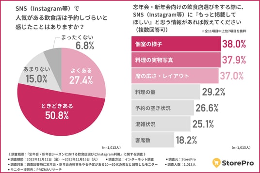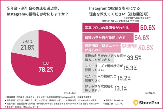 StorePro(所在地:東京都港区)は、忘年会・新年会の幹事をやる予定がある20~30代の男女を対象に、「忘年会・新年会シーズンにおける飲食店選びとInstagram利用」に関する調査を行いました。
