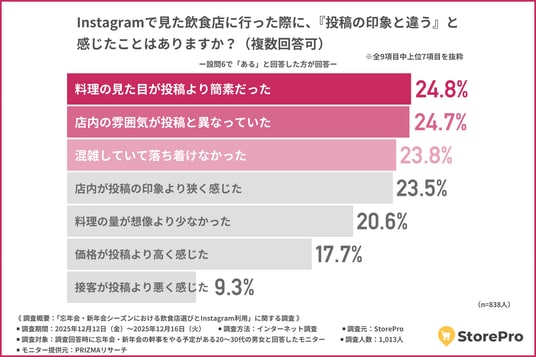 「Instagramで見た飲食店に行った際に、『投稿の印象と違う』と感じたことはあるか」について尋ねたところ、『料理の見た目が投稿より簡素だった(24.8%)』が最多となり、『店内の雰囲気が投稿と異なっていた(24.7%)』『混雑していて落ち着けなかった(23.8%)』と続きました。