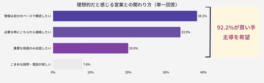 「情報は自分のペースで確認したい」38.3%、「必要な時にこちらから連絡したい」33.9%、「重要な局面のみ会話したい」20.0%と、92.2%が買い手主導の接点を希望しています。