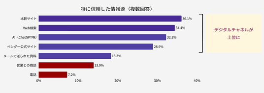 「特に信頼した情報源」についても、「比較サイト」36.1%、「Web検索」34.4%に次いで「AI(ChatGPT等)」が32.2%と上位に入りました。一方、「営業との商談」を信頼した情報源として選んだのは13.9%にとどまっています。