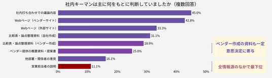 社内キーマンが主に何をもとに判断していたかを確認したところ、上位は「社内打ち合わせでの議論内容」45.0%、「Webページ(ベンダーサイト)」42.8%、「Webページ(外部サイト)」33.3%でした。