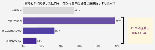 最終判断に関与した社内キーマンと営業担当者の直接対話について確認したところ、「全員話した」はわずか27.2%にとどまりました。