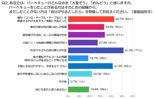 Q2.あなたは、バーベキューのどんな点を「大変そう」「めんどう」と感じますか。バーベキューをしたことがある方はそのときの経験から、まだしたことがない方は「自分がやるとしたら」を想像してお答えください。(複数回答可)