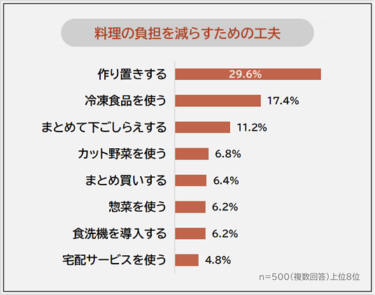 「料理の負担を減らすための工夫」を聞いたところ、1位は「作り置きする(29.6%)」で、30%近くの人から回答を得ました。2位「冷凍食品を使う(17.4%)」、3位「まとめて下ごしらえする(11.2%)」が続きます。