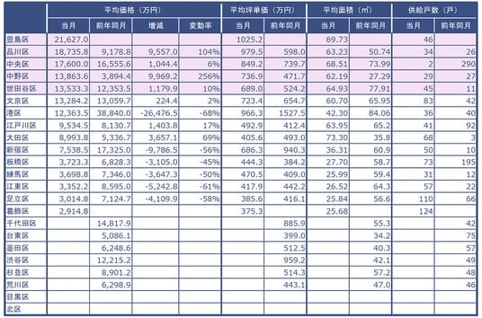 東京23区の各行政区毎に、平均価格、平均坪単価、平均面積、供給戸数をまとめました。当月の平均価格が大きい順に表示しています。