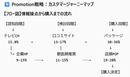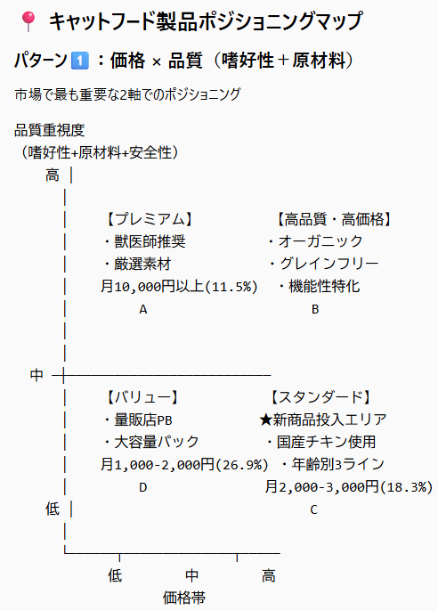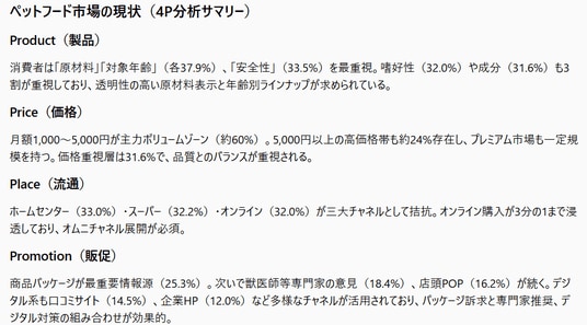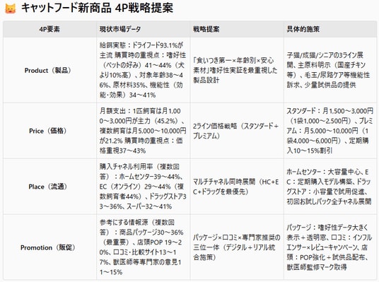 【4P分析・新商品戦略視点】では、キャットフード市場において有効な製品設計・価格帯・流通チャネル・販促施策が明確になりました。安全性や原材料への関心の高まりを背景に、価格帯別の商品展開とマルチチャネル戦略、パッケージと専門家評価を組み合わせたプロモーションが、新規商品の競争力向上につながることが示されています。