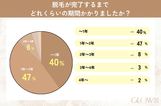 脱毛が完了するまで、「1年~2年」(47%)「~1年」(40%)かかったという回答が多く集まりました。