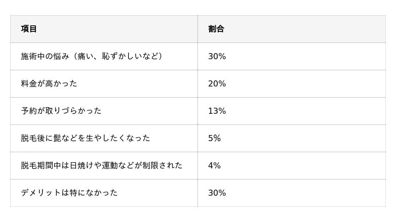 - 施術のデメリットは、「施術中の悩み(痛い・恥ずかしいなど)」(30%)が最も多い