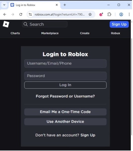 ユーザーがゲームにアクセスしようとすると、Robloxの正規ログインページを模倣した第二段階のフィッシングページにリダイレクトされます。ここで入力された認証情報は、ユーザーが気付かないまま収集されます。ユーザーには同じページが表示されたままで、侵害の兆候は一切見られません。